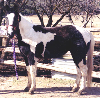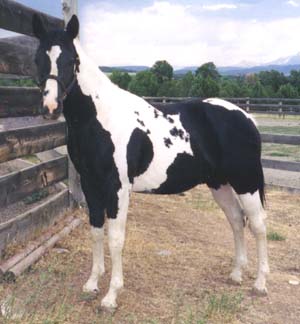 SOLD 2000 APHA Black and White Tobiano Gelding. "Pairadice" is a very willing quiet horse who is eager to please. He's been started in training, and has been out on the trail. Fathered by the now deceased Sierra High Eagle who goes back to Doc Bar. On the bottom side goes back to Mr Flick. Should mature to 16 hands. Priced at $3,500. | |