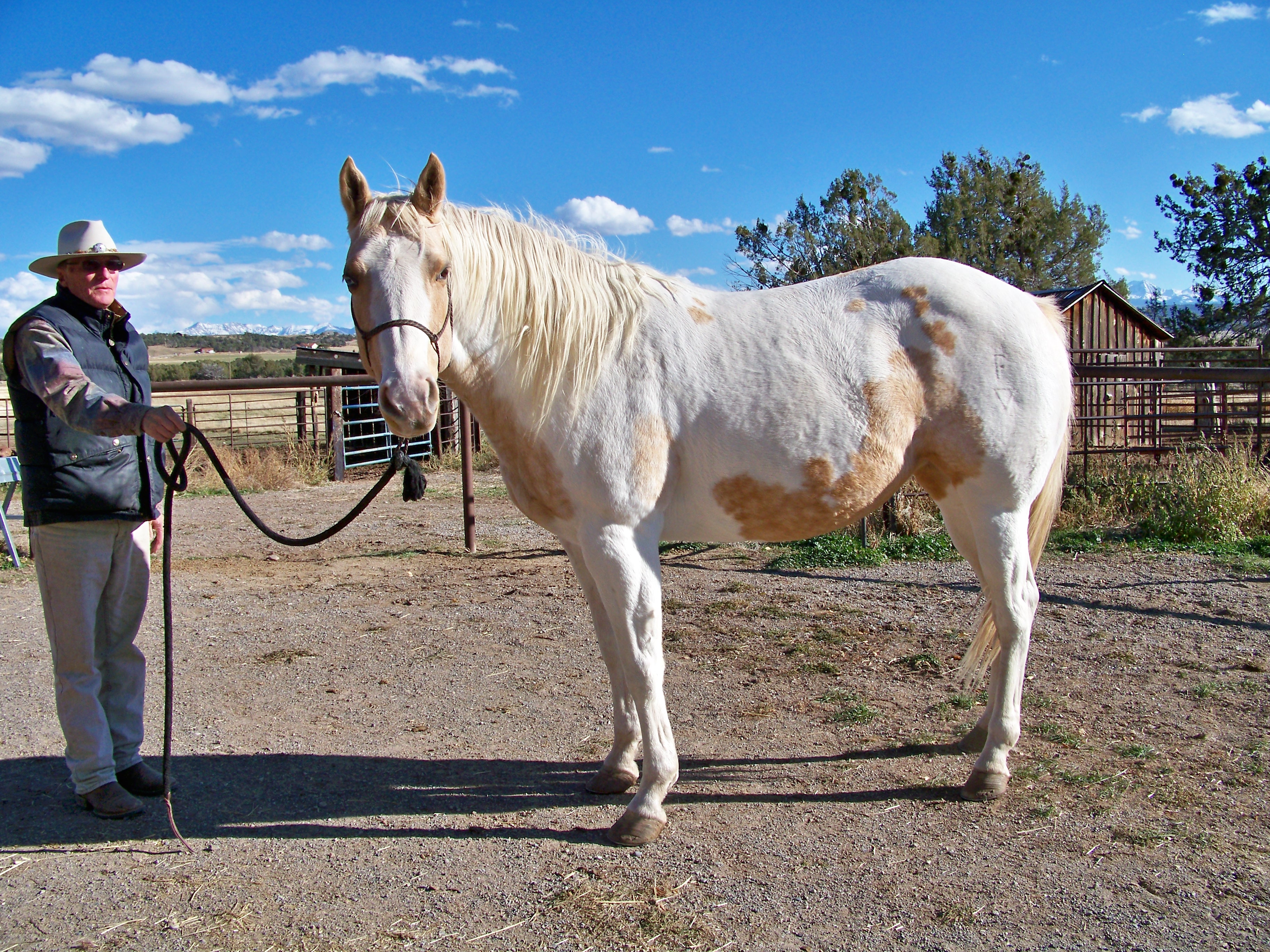 Dream Saffron is going well under saddle. She is likely homozygous for the tobiano gene and is a horse with a real people disposition. | |